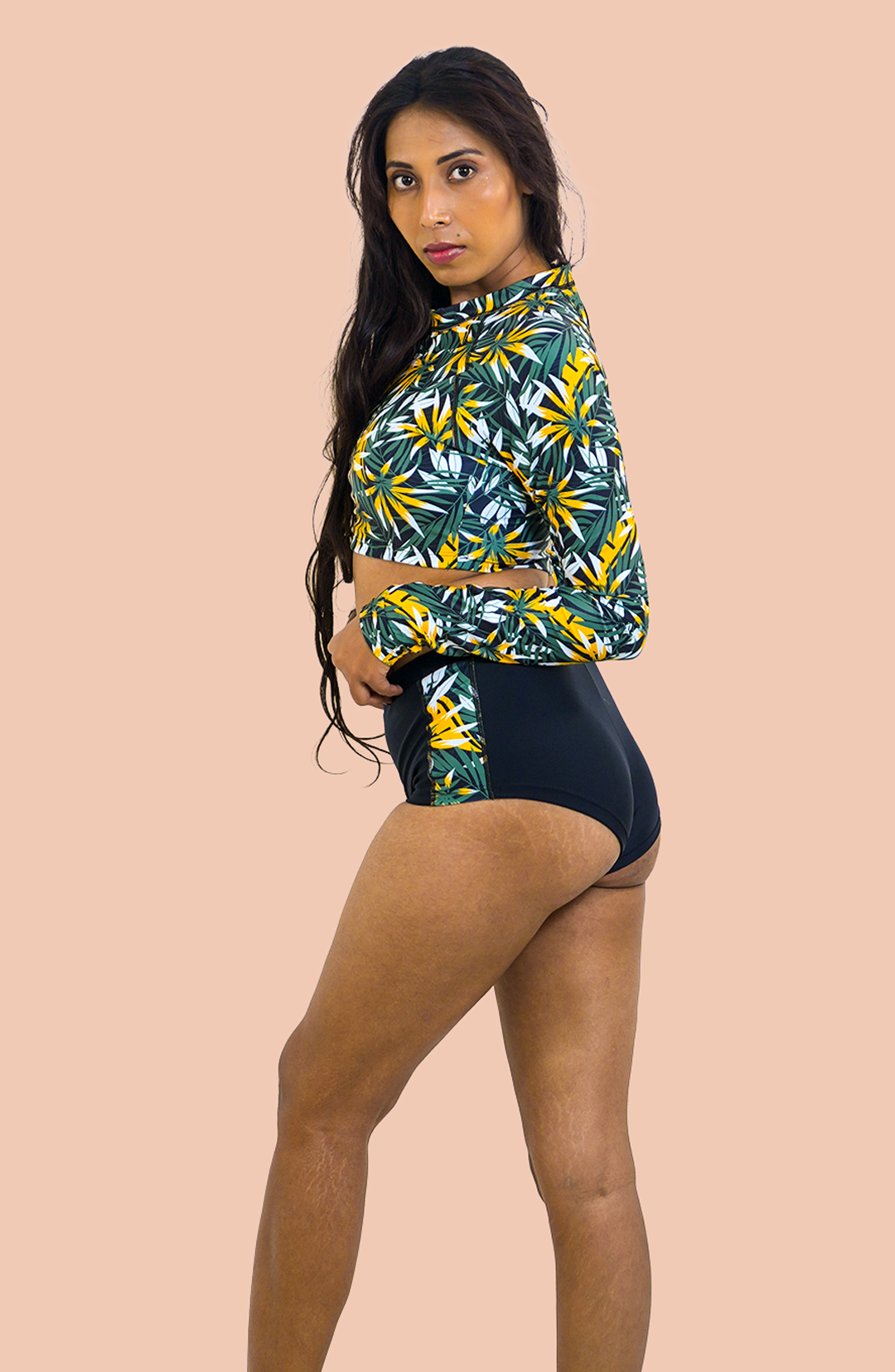Bring the vibrant energy of Florida to your swimwear with the Palm colada Swim Set. Featuring a tropical-print long-sleeve top and sleek high-waist...